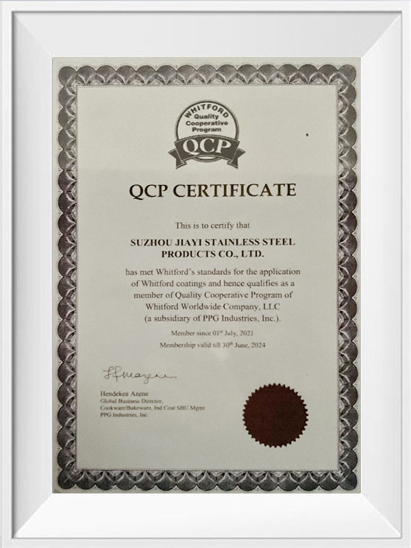 회사는 관리 시스템---ISO9001:2000, 환경 경영 시스템---ISO14001:2004, ROSH 및 FDA에 따라 라이센스를 받았습니다. 제품은 유럽, 북미, 중동, 동남아시아 및 기타 국가 및 지역에 판매되어 전 세계 고객이 선호합니다. 중국 하드웨어 협회 회원이자 금속 케이터링 및 조리 도구 국가 표준화 기술 위원회의 회원으로 현재 중국 내 붙지 않는 조리기구 초안 작성 단위 중 하나로 알려져 있으며 샹청 지구 세금 납부 상위 100대 기업으로 알려져 있습니다. 장쑤성에서는 정직한 기업, 장쑤성에서는 AAA급 "계약 신용" 기업으로도 알려져 있습니다..